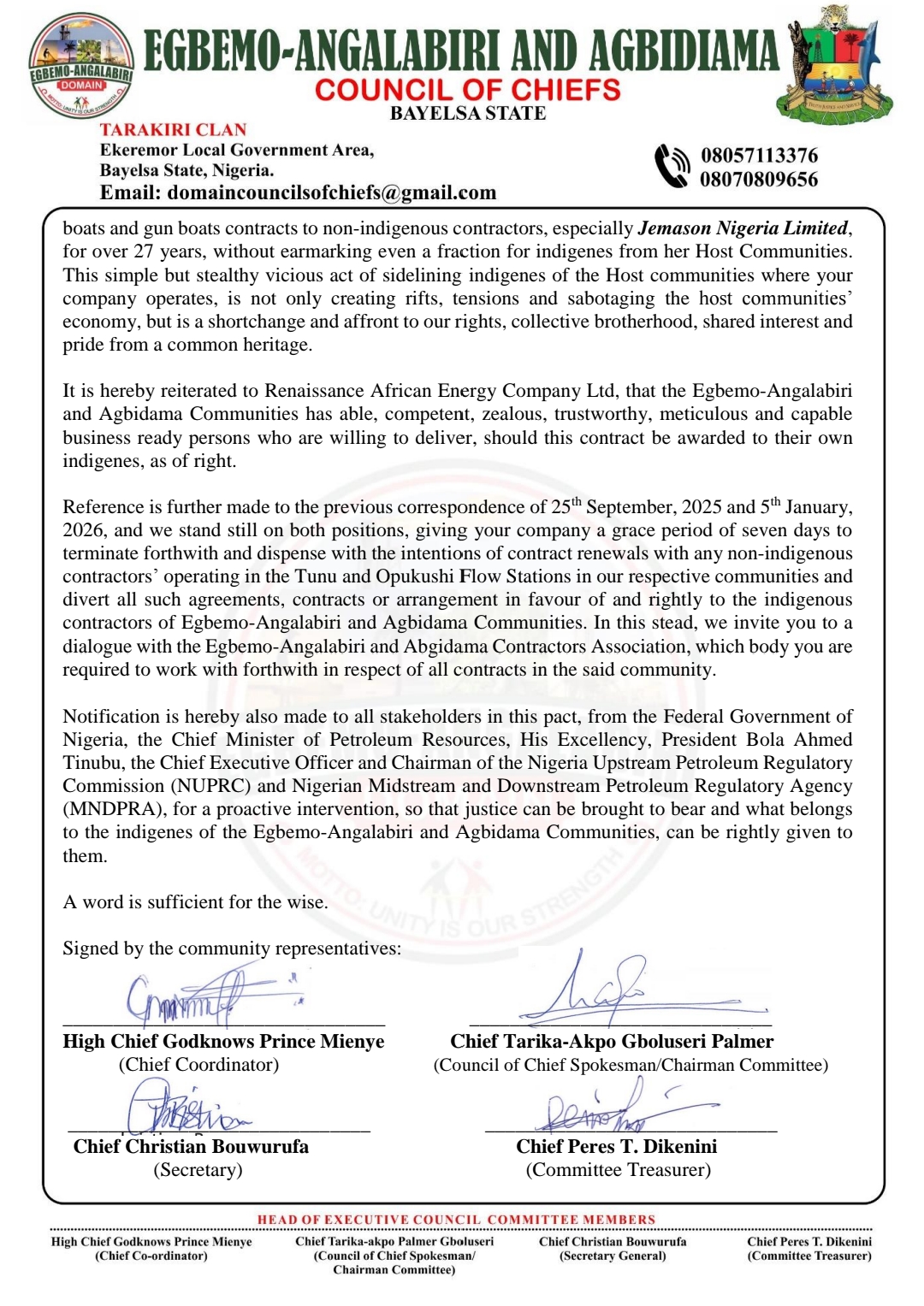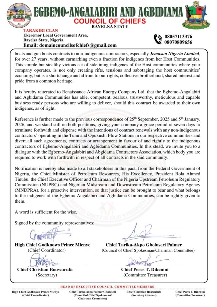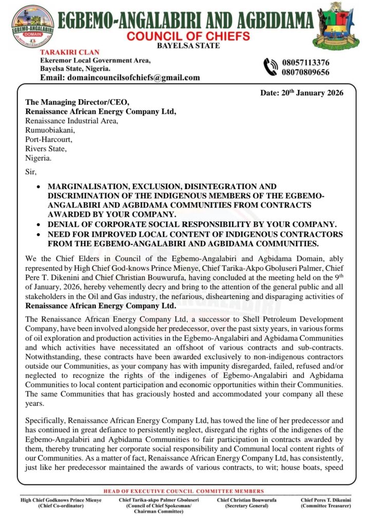 Egbemo-Agalabiri And Agbidima Councils Of Chiefs , Ekeremor Local Government Area, Bayelsa State WritesRenaissance African Energy Company Ltd Over Marginalization, Exclusion