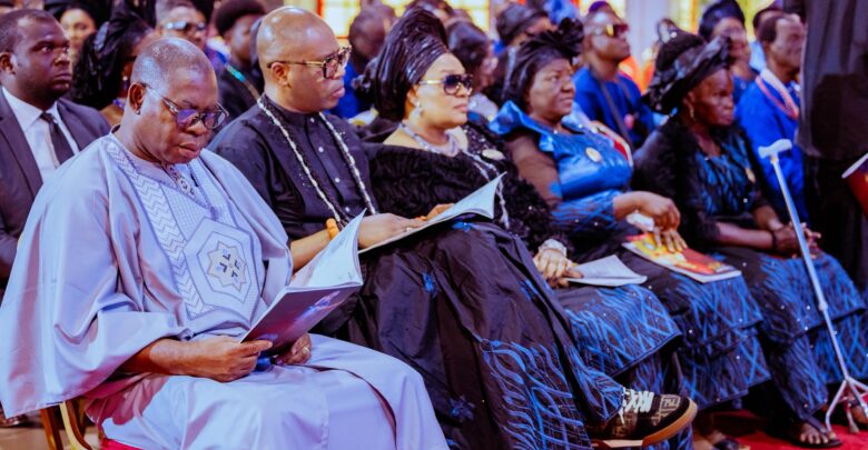 Delta State Governor, Rt. Hon. Sheriff Oborevwori, on Friday, joined other dignitaries to pay tribute to the late Mrs. Cordelia Eduesi Megbele at a well-attended funeral service held at the Foursquare Gospel Church, Warri.